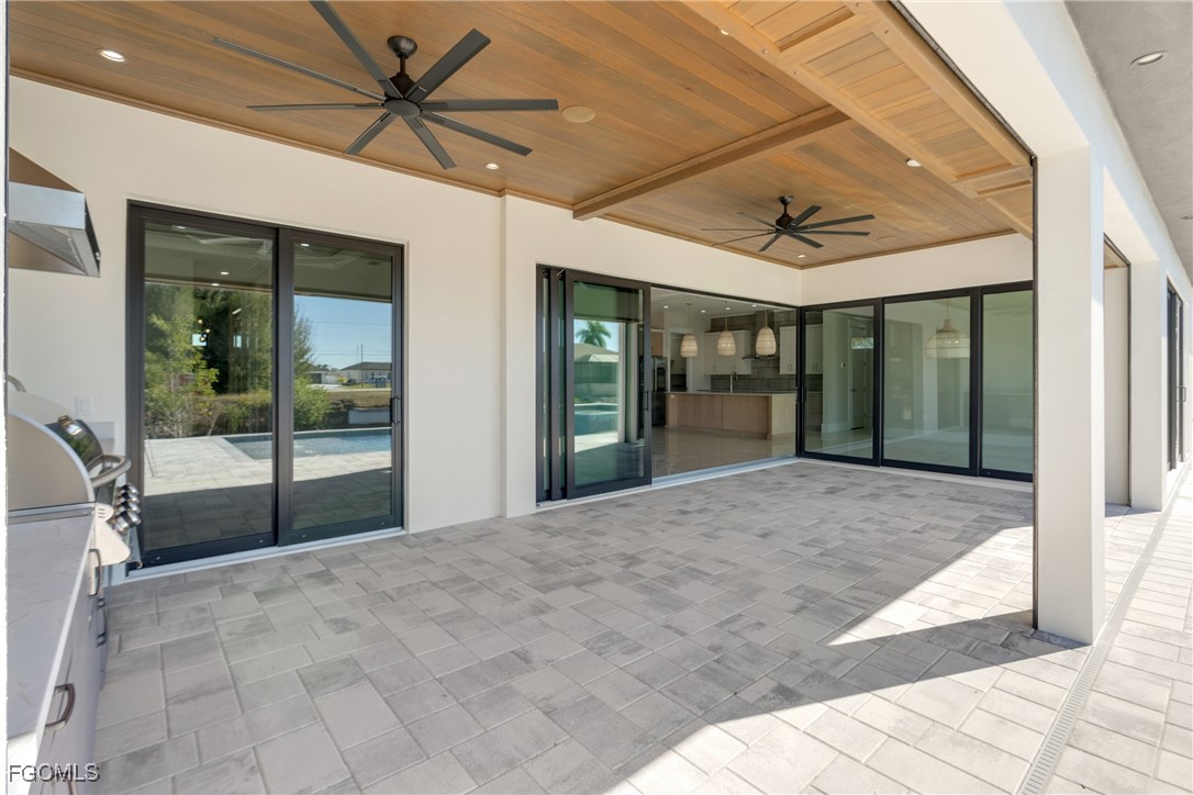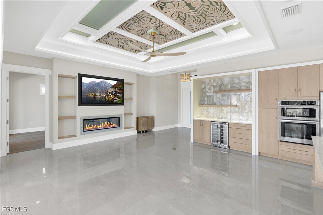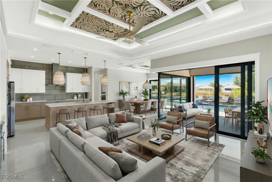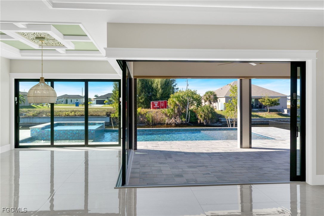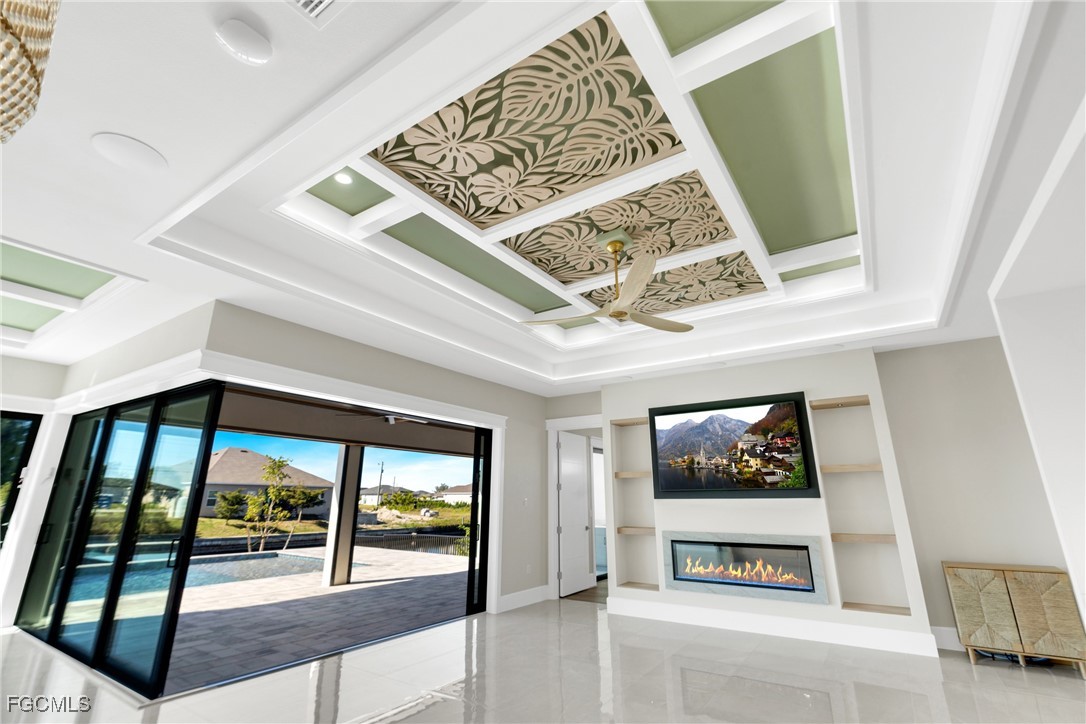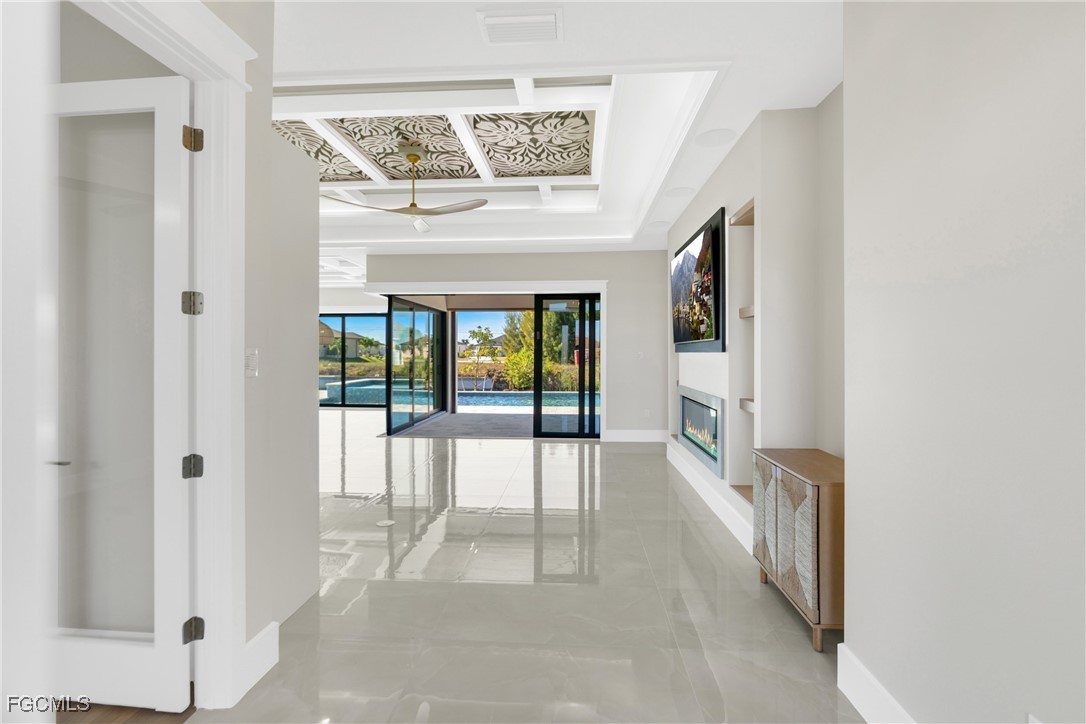 The interior showcases quartz countertops, decorative ceiling details, and tile flooring throughout the main living areas, complemented by wood flooring in the study and primary suite. The expansive great room is anchored by an electric fireplace, a built-in 75” LG smart TV, and dramatic 90-degree corner sliding glass doors, creating a seamless indoor-outdoor living experience. A custom dry bar with backlit countertops, integrated sound system, and home automation elevate the home for both everyday comfort and sophisticated entertaining.