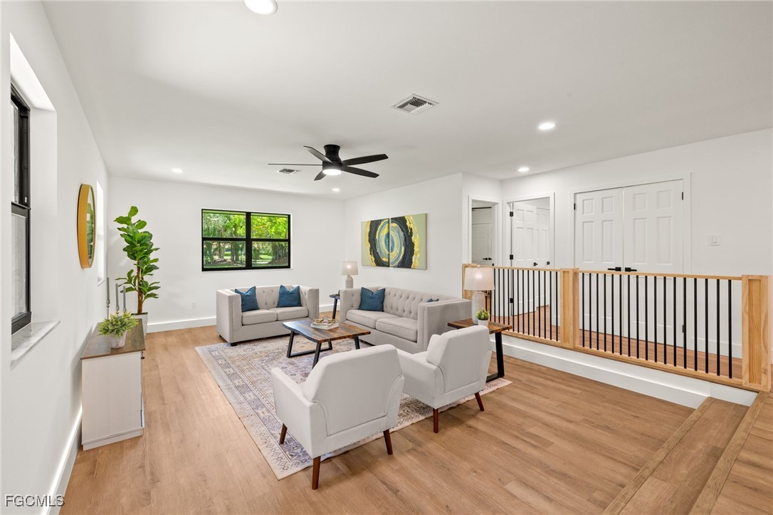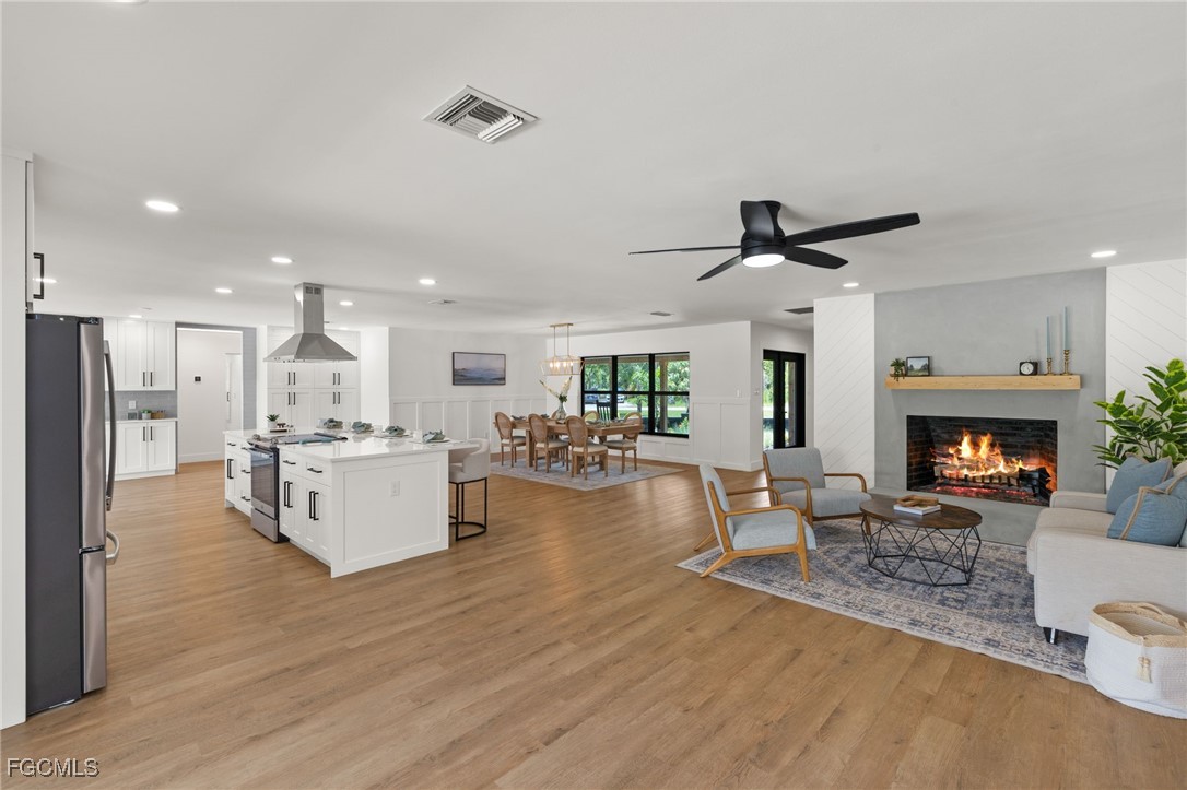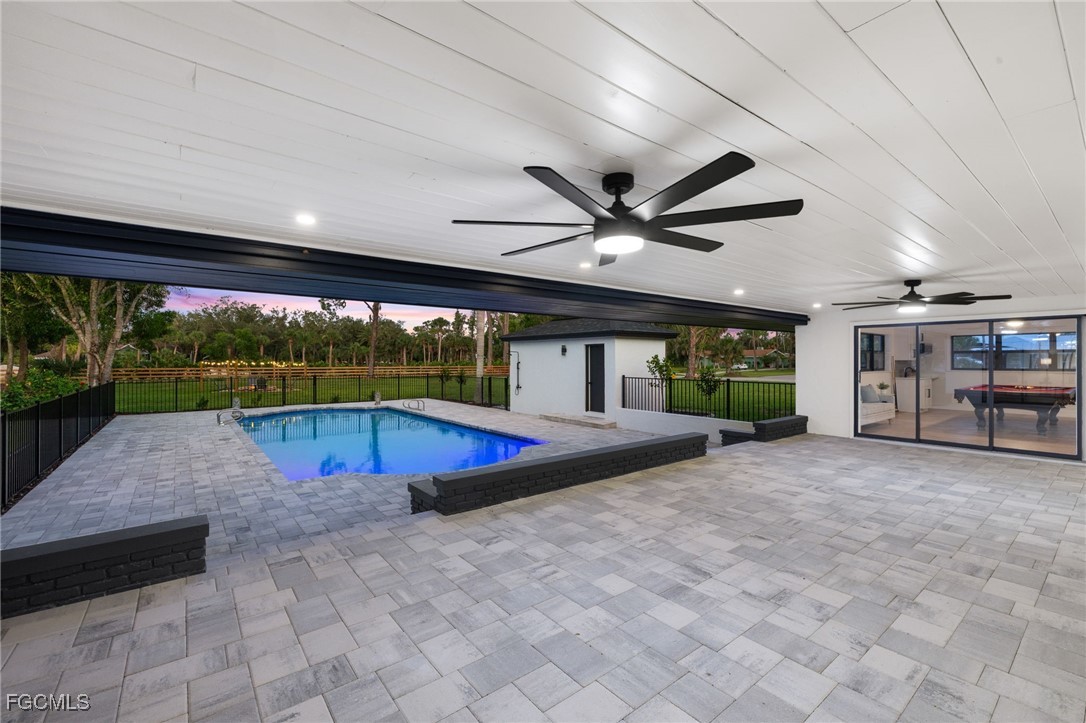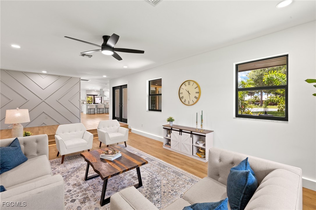 A rare opportunity to own an extensively renovated estate home on acreage in the heart of Ft Myers, located in Heritage Farms, one of the area’s most desirable hidden enclaves offering tranquil, oak-canopied country living just 15 minutes to Fort Myers Beach and 20 minutes to Sanibel Island. This year-long luxury transformation represents over $650,000 in no-expense-spared renovations, delivering more than 4,200 square feet of refined living space on 1.37 acres of mature trees, an increasingly rare combo this close to the beaches. Exterior upgrades include a New Owens Corning shingle roof, New 4-ton and 2.5-ton A/C systems, full plumbing re-pipe, New hurricane-impact windows and French doors, an 18-foot hurricane-rated garage door, dual water heaters, irrigation on well, and a state-of-the-art whole-home reverse osmosis water purification system. The resort-style outdoor living area features a new pebble-finish pool with color-changing LED lighting, new equipment, brick paver pool deck and lanai, black aluminum pool fencing, outdoor pool bath with shower, fire pit with Edison lighting, enhanced exterior lighting, and multiple tree swings. Inside, the home showcases wide-plank flooring throughout, 5 inch baseboards, extensive LED recessed lighting, custom wood feature walls, pine solid-wood interior doors with black hardware, bespoke accent lighting, a formal living room with a custom-built railing and integrated LED baseboard lighting, and a family room anchored by a certified brick wood-burning fireplace with smooth stucco finish and custom wood mantle. The kitchen is a true centerpiece with white shaker cabinetry including 42” uppers, multiple freestanding pantries, quartz countertops, an expansive oversized island with storage on both sides, GE stainless appliances including dual refrigerators, and subway tile backsplash extending around the kitchen window. The primary suite offers a private retreat with a custom wood focal wall and seating area, two walk-in closets, an expansive white shaker vanity with quartz counters and custom mirror, freestanding soaking tub, frameless glass shower, and a private screened garden area, while three additional guest baths feature large-format porcelain tile showers, white shaker vanities with quartz counters, and modern black mirrors. An in-law suite with kitchenette and private entrance provides exceptional flexibility, ideal for extended family, guest lodging, or a private home office, further enhanced by AG-2 zoning which allows for operating a business from the property subject to code. Additional highlights include custom LED-lit hallways, an oversized laundry room, epoxy-finished garage, and 4 sets of pocket sliders opening to the expansive lanai with wood-plank ceilings matching the front porch. Located in a top-tier school district with the new Nova Classical STEM Academy opening in 2026 just minutes away, this is a truly irreplaceable estate-style offering on acreage in a central Ft Myers location.
