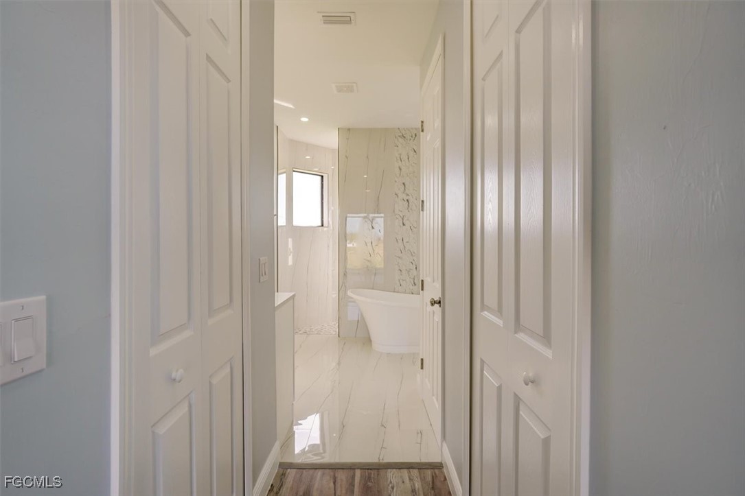 Elegant marble-look tile flows throughout the main living areas, while the bedrooms feature stylish and durable luxury vinyl plank flooring. The additional bedrooms share a beautifully appointed guest bathroom with a tub/shower combination.