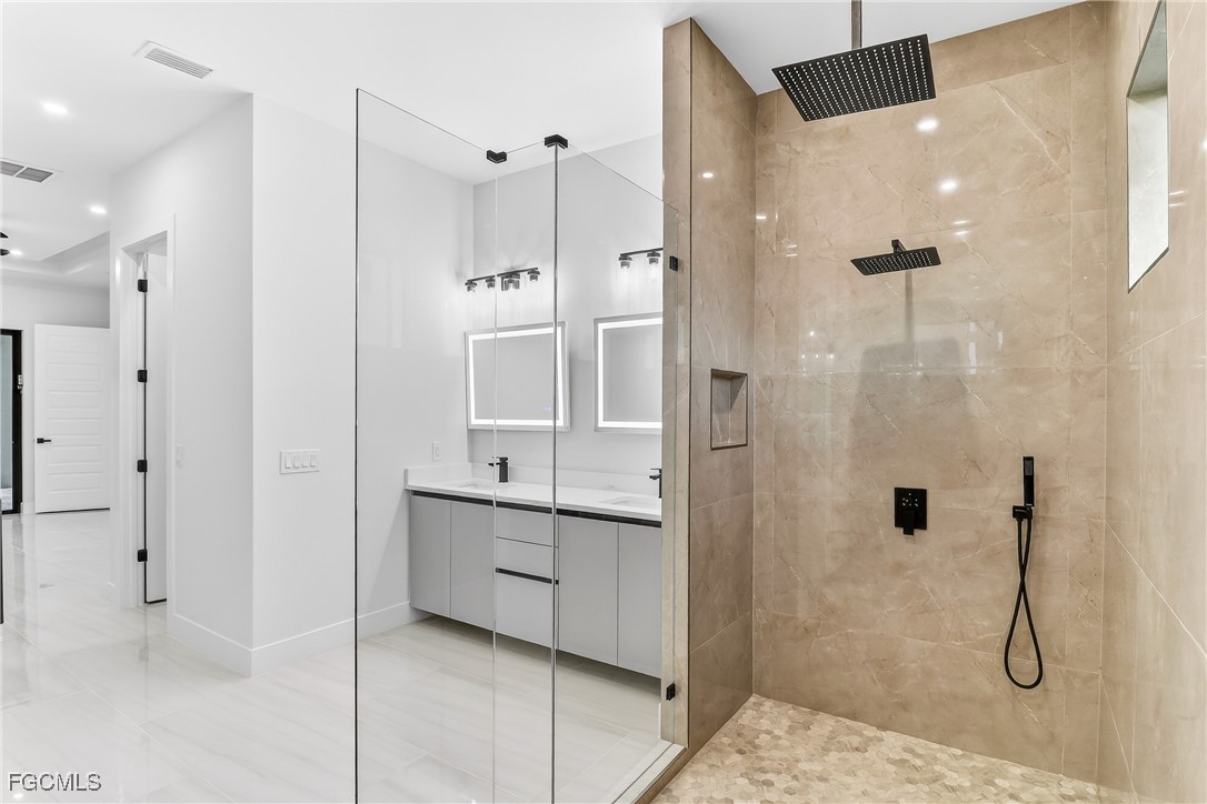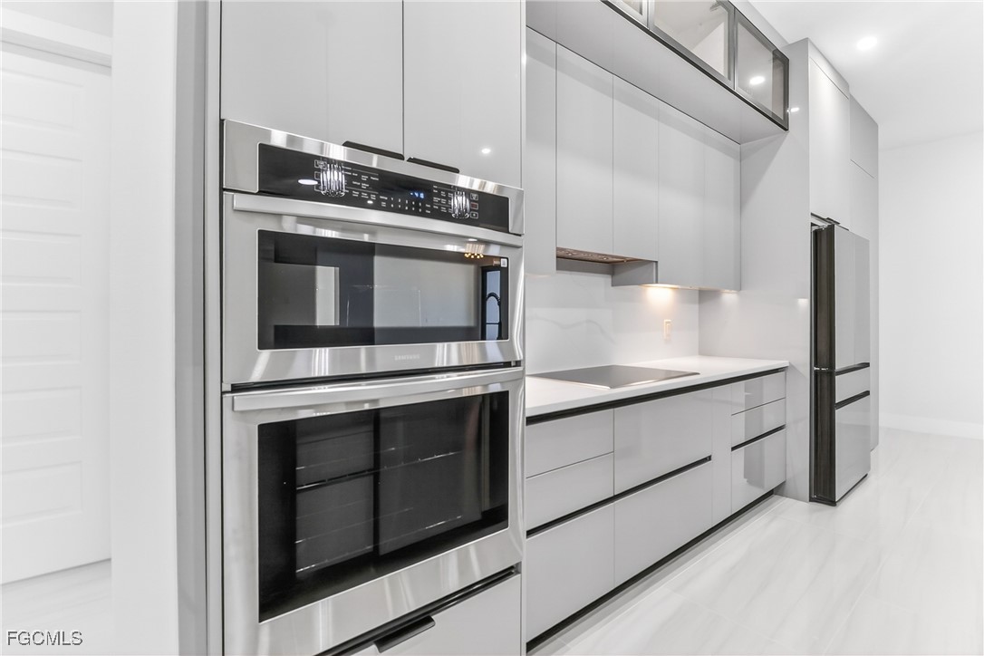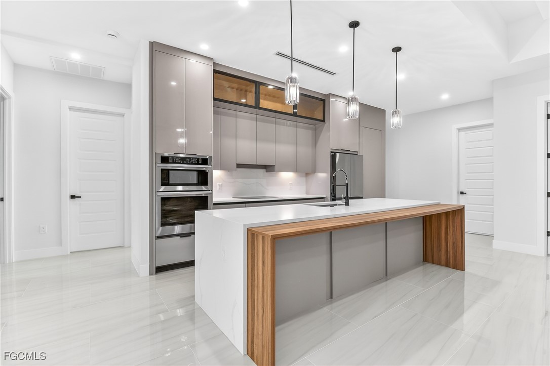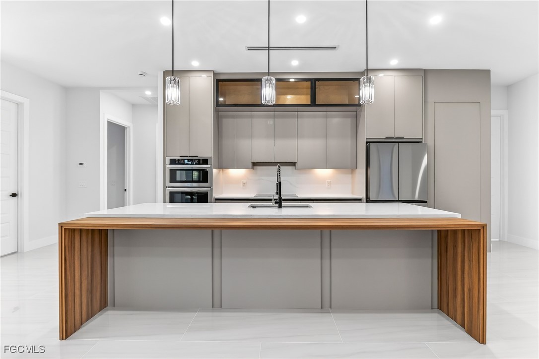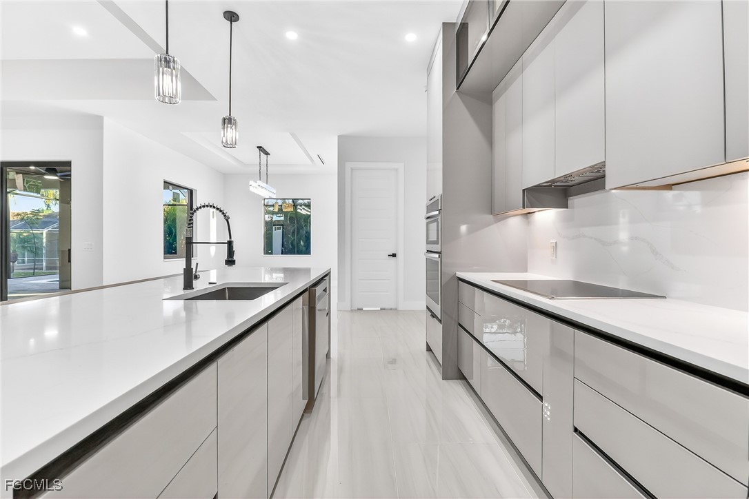 Southern Exposure Luxurious New Pool Home Nestled in the highly sought-after and tranquil residential neighborhood South of Cape Coral Parkway Built across from Gulf access homes in Unit 69 .Cape Coral’s exclusive SW corridor of Luxurious Estate homes. This luxurious single-story masterpiece with Southern Exposure offers the perfect blend of elegance, comfort, and modern sophistication. From the moment you arrive, you’ll be captivated by the home’s clean architectural lines, expansive driveway, and impeccable curb appeal. Step inside to soaring ceilings, premium finishes, and a light-filled open-concept design that seamlessly blends indoor and outdoor living. This magnificent residence features a thoughtfully designed 3-bedroom + Den/office, 3-bathroom layout that caters to both relaxed living and stylish entertaining. The chef-inspired kitchen boasts custom cabinetry, walk in Pantry ,quartz waterfall edge custom center island and quartz countertops with stainless steel appliances includes separate cooktop and built in oven and Microwave combo all flowing effortlessly into the main living space. Designer large Porcelain tile flooring runs throughout the home adding to the upscale luxurious feel. Enjoy appointments in the living and dining area. The primary suite offers a serene retreat with dual vanities, a walk-in shower and separate soaking tub within, spacious custom built walk-in closets. Two additional bedrooms provide plenty of space for family or guests. For added safety and energy efficiency, the home is equipped with Low E impact-resistant full storm protection windows and doors, offering year-round peace of mind. Step outside to the covered lanai featuring a fully equipped outdoor kitchen, complete with a built-in gas grill, drink cooler fridge and sink—ideal for effortless outdoor cooking and entertaining. Adjacent to the pool area, a convenient pool bathroom offers easy access and added comfort for swimmers and guests. The beautifully landscaped backyard also showcases a custom-designed saltwater pool heated pool and European style spa that disappears within pool creating a private oasis fully screened for relaxation and outdoor enjoyment. Located just minutes from Cape Harbour, waterfront dining, boutique shopping and some of Southwest Florida’s finest beaches. This Newly constructed luxurious home delivers an exceptional living experience in one of Cape Coral’s most prestigious neighborhoods.