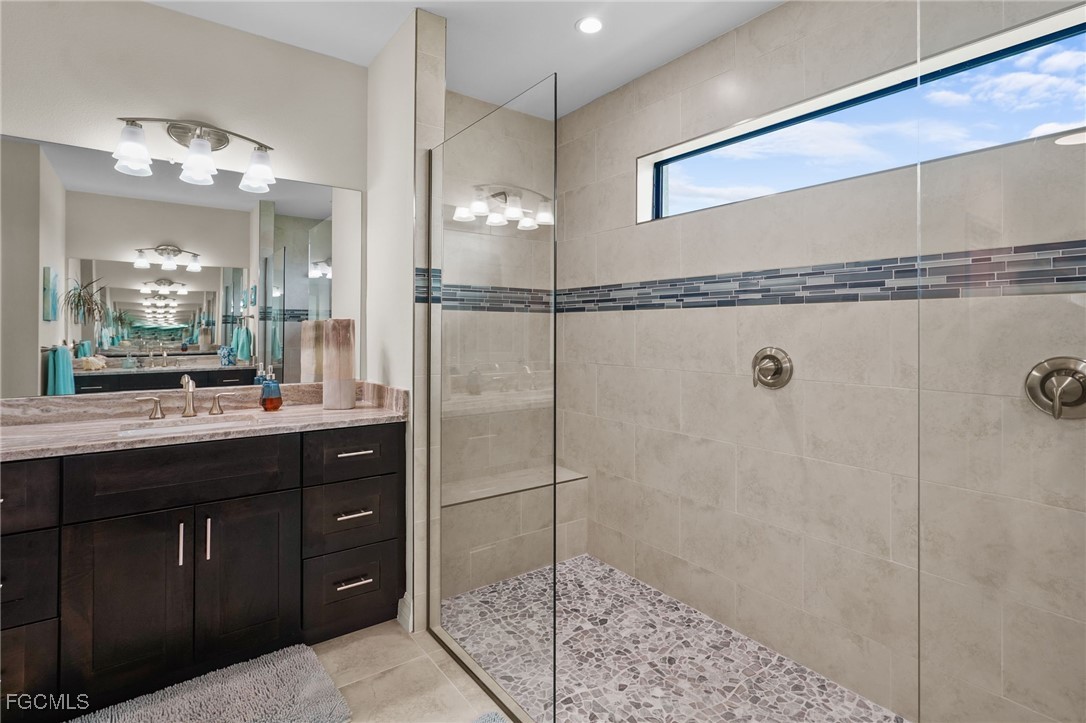 Retreat to the luxurious primary suite—your private oasis with a spa-like walk-in shower (dual heads), dual vanities and generous dual walk-in closets. Sliding glass doors open directly to the lanai for serene mornings or starlit evenings.