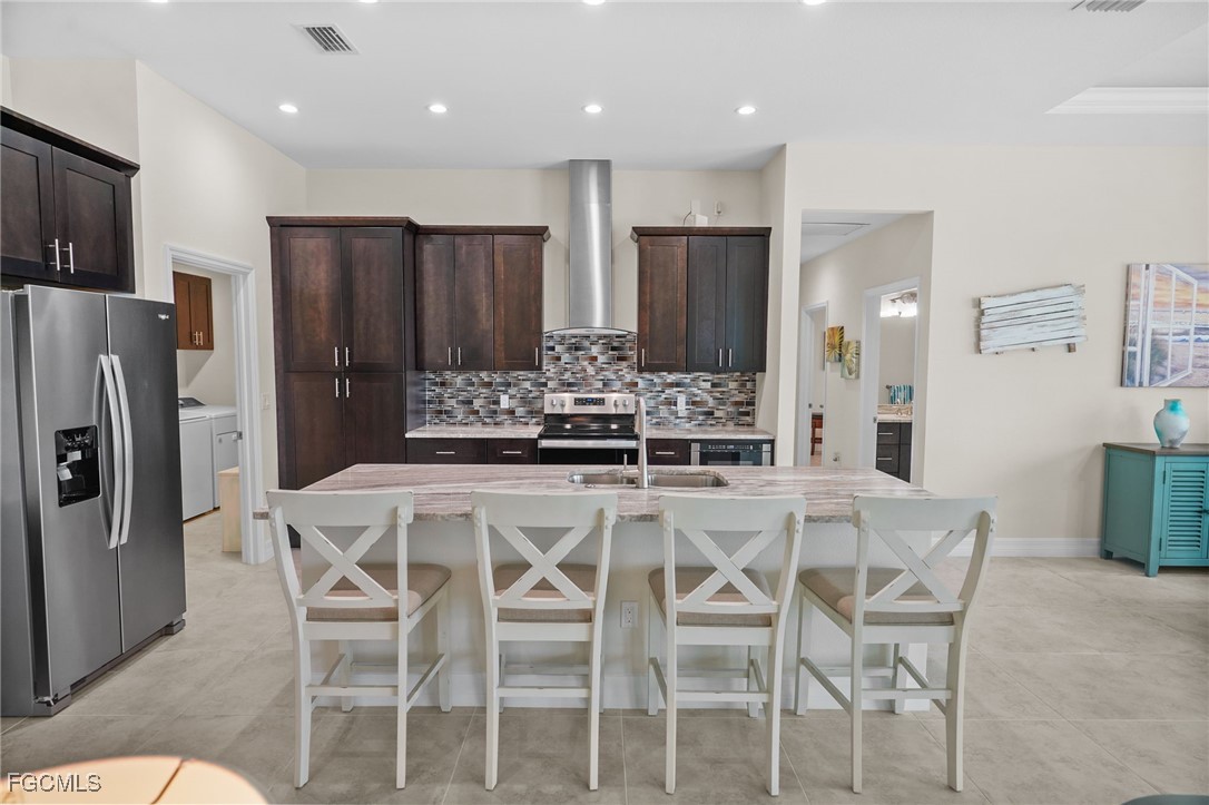 The gourmet kitchen steals the show: exquisite cabinetry, sleek granite countertops, a massive island perfect for gatherings, and stainless-steel appliances. A dedicated laundry room nearby adds convenience with extra storage, a sink, and pantry space.