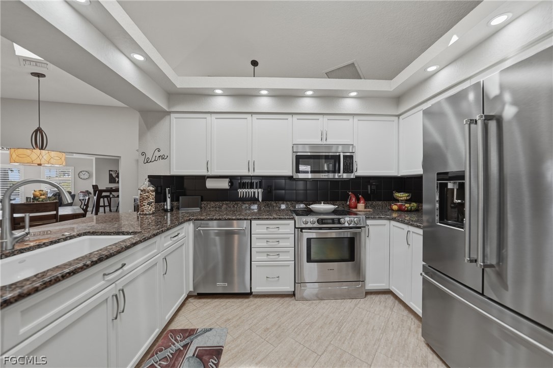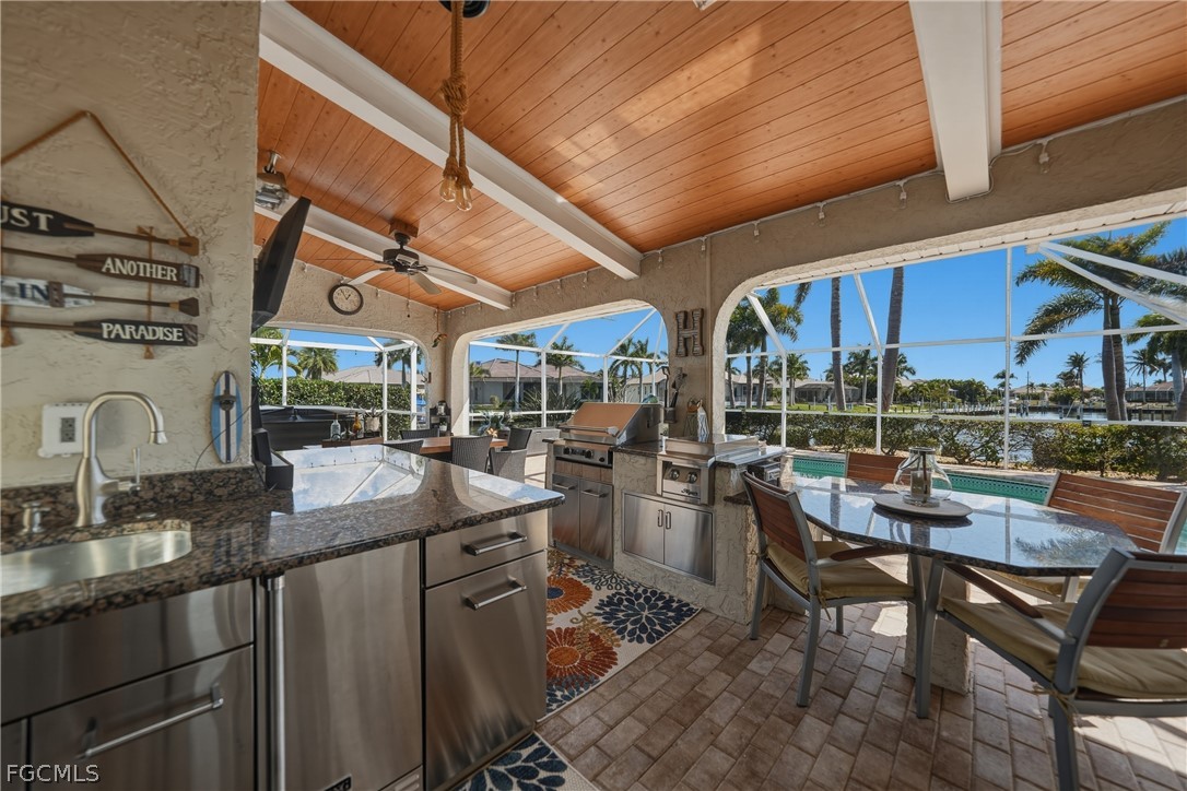 Welcome to the highly sought after community of Punta Gorda Isles! This 3 bed 2 1/2 bath waterfront pool home features a stunning 182 feet of water frontage, breathtaking wide water views, and an outdoor lifestyle designed to impress. From the moment you enter, you’ll love the light-filled living room with vaulted ceilings and stunning canal views. There are two spacious living areas plus a formal dining room with a custom dry bar, all perfect for entertaining. The well appointed kitchen has stainless steel appliances, granite countertops, a built-in coffee system, and a pass-through window to the lanai - seamlessly connecting indoor and outdoor living. The primary suite has a large bedroom with a tray ceiling, private lanai access, an expansive walk in closet, and leads to your en suite bathroom. The bath features dual sinks, a walk in shower, and a separate soaking tub. A thoughtfully designed split floor plan includes a guest wing with pocket door for added privacy. Both guest bedrooms are large in size and there is a full bath with a walk in shower and convenient pool access. There is also a half bathroom. The interior laundry room has a laundry tub and added storage. Step on out to the pavered lanai and an extraordinary outdoor living experience plus an outdoor lounge patio. The heated saltwater pool showcases a water feature and variable speed pump, while the hot tub conveys with the home. The Viking outdoor kitchen elevates alfresco entertaining, all set against an expansive, panoramic water view with desirable southern exposure. Enjoy boating? You are only steps away from your THREE concrete docks & a 25,000lb boat lift with quick power boat access out to Charlotte Harbor and beyond to the open waters of the Gulf. With a jet ski lift, kayak rack, and fish cleaning station, you have a true waterfront playground right in your backyard. Other features include: newer standing seam metal roof, gutters, impact skylights, impact windows, PEX piping, tile flooring throughout, plantation shutters, hurricane screens on the lanai, and an epoxy-finished garage floor with added shelving for optimal storage. This home is conveniently located to Fishermen's Village, downtown Punta Gorda, shopping, dining, medical, entertainment, and so much more.